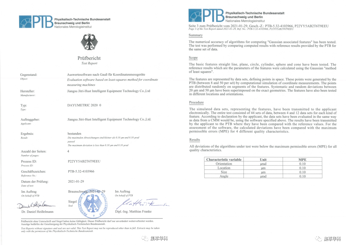 DAYUMETRIC測量軟件專(zhuān)為測量機研制和開(kāi)發(fā),具備八大特征功能:多種特征創(chuàng )建方法、多種模型對齊方法、拖拽式界面操作和編程、解決方案定制和讀寫(xiě)、支持不同形式的報告、快速的路徑生成方法、通用量規和客制化量規、高精度半徑補償方法、定制葉片高效測量方法。2021年1月,DAYUMETRIC測量軟件獲得PTB最高等級精度認證(方向、角度精度0.10角秒,位置、長(cháng)度精度0.10微米)。