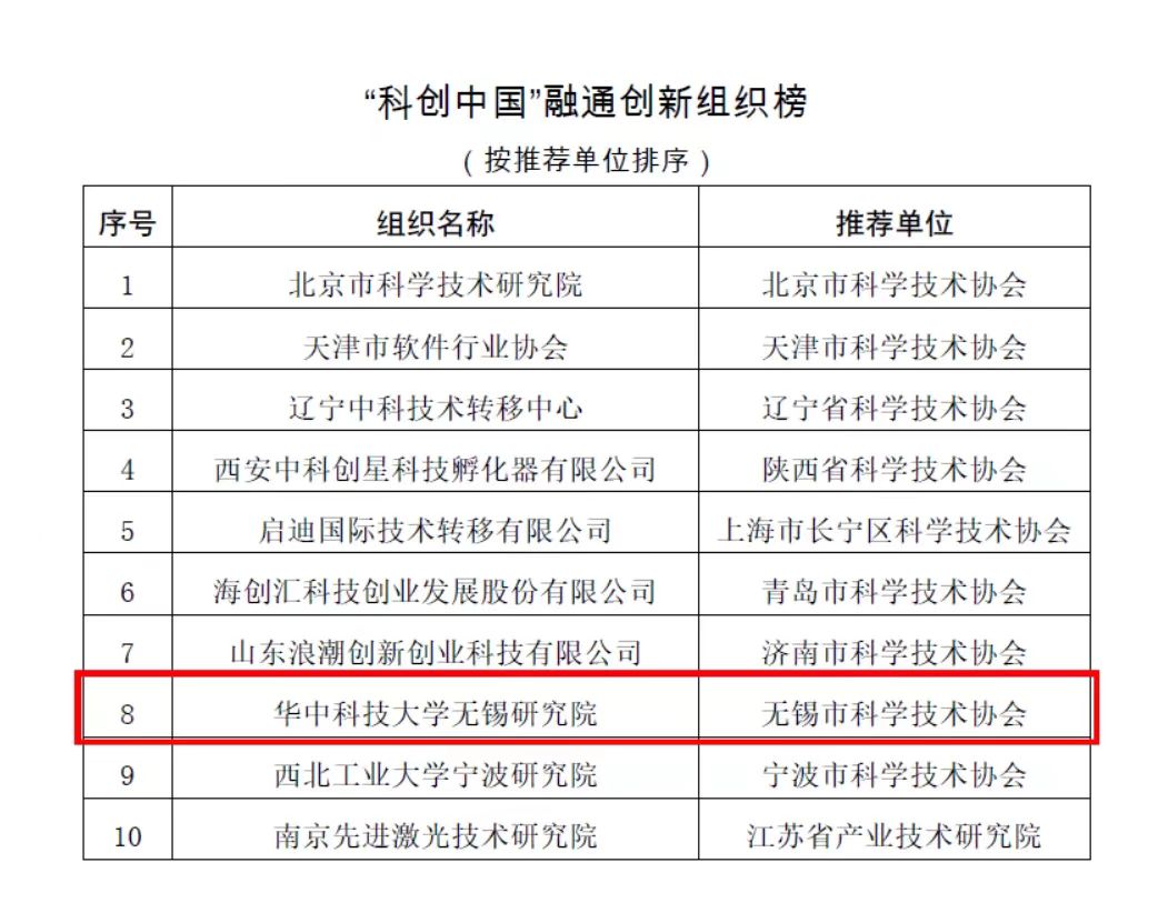 日前,中國科協(xié)公布了2022年“科創(chuàng )中國”系列榜單遴選結果,華中科技大學(xué)無(wú)錫研究院榮登2022年“科創(chuàng )中國”融通創(chuàng )新組織榜(全國共10家)。