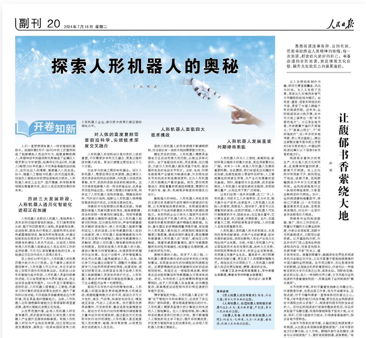 人們一直夢(mèng)想擁有像人一樣的智能機器助手。戰國時(shí)期《列子·湯問(wèn)》中的工匠偃師制造了能夠模擬人類(lèi)動(dòng)作行為、能歌善舞的偶人;希臘神話(huà)中的赫菲斯托斯鑄造了金屬巨人塔羅斯以守護家園;經(jīng)典科幻作品《我,機器人》暢想2035年機器人不僅具備高超的運動(dòng)能力,還衍生出人類(lèi)情感,高度融入人類(lèi)生活。如今,隨著(zhù)人工智能與機器人技術(shù)迅猛發(fā)展,創(chuàng )造仿人智能伙伴的想法逐漸成為現實(shí),人形機器人將在工業(yè)生產(chǎn)、醫療健康、科學(xué)探索等領(lǐng)域發(fā)揮重要作用,助力人類(lèi)邁向更加美好的未來(lái)。歷經(jīng)三大發(fā)展階段,人形機器人通用化智能化進(jìn)程正在加速人形機器人也稱(chēng)仿人機器人,是指具有人類(lèi)形態(tài)和功能的智能機械體。它們通常擁有頭部、軀干和四肢等類(lèi)人結構,具備感知決策、運動(dòng)控制、肢體執行等能力,能夠利用先進(jìn)的傳感器捕捉視覺(jué)、觸覺(jué)和聽(tīng)覺(jué)等信息,并通過(guò)控制系統實(shí)現類(lèi)似于人類(lèi)神經(jīng)傳導的功能,用伺服電機模擬人類(lèi)關(guān)節運動(dòng)。這些類(lèi)人特性使得人形機器人能夠適應人類(lèi)生活和工作的各種場(chǎng)景,不僅可以承擔繁重危險的任務(wù),也能通過(guò)交互協(xié)作成為人類(lèi)得力助手。自上世紀60年代至今,人形機器人的發(fā)展歷程大致分為三個(gè)階段。在千禧年之前的早期探索中,人形機器人可以行走,并在手部功能上實(shí)現外觀(guān)仿形和簡(jiǎn)單運動(dòng)。在其后10余年的智能化起步階段,人形機器人具備初級感知功能,可以有限度地與外界環(huán)境互動(dòng),并且運動(dòng)自由度有所提升。2016年至今是智能化進(jìn)階階段,人形機器人搭載起人工智能、機器學(xué)習和計算機視覺(jué)系統等先進(jìn)技術(shù),提升了感知和認知功能,不僅能夠靈活敏捷地適應外界環(huán)境,而且具備通識理解能力。當前,人形機器人在環(huán)境理解和智能交互等領(lǐng)域取得顯著(zhù)進(jìn)展,通用化智能化進(jìn)程正在加速。從世界范圍內看,全球人形機器人研發(fā)競爭激烈,很多國家和地區已將發(fā)展人形機器人產(chǎn)業(yè)提升至國家戰略高度。我國人形機器人研究與產(chǎn)業(yè)尚處培育期,但已呈現出加速發(fā)展趨勢,涌現出一批具有國際競爭力的人形機器人企業(yè),部分技術(shù)成果已接近國際領(lǐng)先水平。對人體的高度復刻需要前沿科學(xué)、尖端技術(shù)深度交叉融合人形機器人的結構設計是對奇妙人體的重塑,不僅需要多學(xué)科交叉融合,更是尖端科技的集大成者。其設計原理主要包含以下幾個(gè)方面。仿生學(xué)與機械工程的有機融合。設計人形機器人,需要運用仿生學(xué)原理,通過(guò)模仿人類(lèi)的身體結構和運動(dòng)規律,為機器人創(chuàng )造類(lèi)似骨骼、關(guān)節、肌肉和皮膚系統的機械結構。這不僅使其能夠像人類(lèi)一樣自然地運動(dòng),還具備靈活性和適應性。機械工程理論的新發(fā)現,則保證了人形機器人結構的穩固。精確選擇材料、巧妙設計結構,能夠讓人形機器人保持穩定高效的運行狀態(tài),從而勝任復雜任務(wù)。傳感技術(shù)與控制理論的集成突破。傳感器扮演著(zhù)人類(lèi)感知器官的角色,能夠像眼睛、耳朵和皮膚一樣感知環(huán)境信息。視覺(jué)傳感器通過(guò)攝像頭捕捉環(huán)境圖像,讓人形機器人能夠識別物體、區分顏色和形狀;聲音傳感器接收并解析語(yǔ)音指令,使人形機器人能夠聽(tīng)懂和回應人類(lèi)的話(huà)語(yǔ);力覺(jué)傳感器仿效人體的力覺(jué)感受,使人形機器人能夠精確感知與外界交互過(guò)程中的接觸力;觸覺(jué)傳感器模仿人類(lèi)觸覺(jué),幫助人形機器人精準感知物體的形狀和硬度?刂葡到y是人形機器人的大腦,借助計算單元和智能算法,處理獲取的數據并作出決策。在這個(gè)過(guò)程中,多種智能算法的應用讓機器人越來(lái)越接近人類(lèi)。比如,強化學(xué)習方法通過(guò)試錯學(xué)習,調整行為策略;深度學(xué)習方法利用深度神經(jīng)網(wǎng)絡(luò ),處理視覺(jué)、語(yǔ)音識別等任務(wù);自然語(yǔ)言處理方法使人形機器人能夠理解人類(lèi)語(yǔ)言并進(jìn)行交互。人形機器人集成多種傳感器與智能控制算法,突破了過(guò)去感控方法單一的局限性。驅動(dòng)方式與執行動(dòng)作的精準協(xié)調。人形機器人的驅動(dòng)器負責將能源轉換為機械運動(dòng),根據能量轉換方式的不同,驅動(dòng)方式可分為電機、液壓、氣動(dòng)等,如高效電動(dòng)馬達、精密液壓系統、氣動(dòng)人工肌肉等。執行器則負責具體操作,可完成抓取、搬運或其他高精度動(dòng)作。驅動(dòng)方式與執行動(dòng)作的精準協(xié)調就像是力量與動(dòng)作的完美映射,通過(guò)驅動(dòng)方式的選取與執行動(dòng)作的調控,人形機器人甚至能復現人類(lèi)的微笑、皺眉、驚訝等表情,從而更加親切自然地與人類(lèi)互動(dòng)。雖然人形機器人的科學(xué)原理不斷清晰明朗,但當前還有一些技術(shù)挑戰需要勠力攻克。健壯靈活的四肢。人形機器人需要具備強有力且活動(dòng)范圍大的四肢,以做出多樣化動(dòng)作。