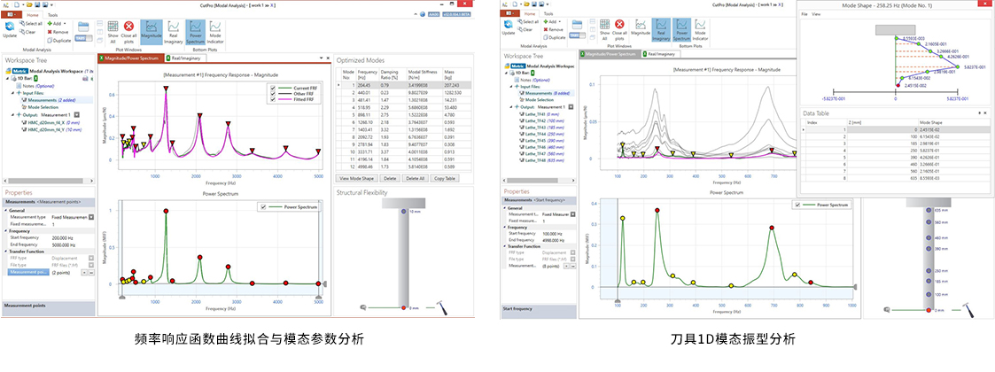 CutPro模態(tài)分析模塊簡(jiǎn)單易用,可以根據測得的頻率響應函數(FRF)自動(dòng)計算出結構模態(tài)參數,并可直接導入銑削、鏜削/車(chē)削和鉆削模塊,用于顫振穩定性預測以及加工過(guò)程仿真分析。
